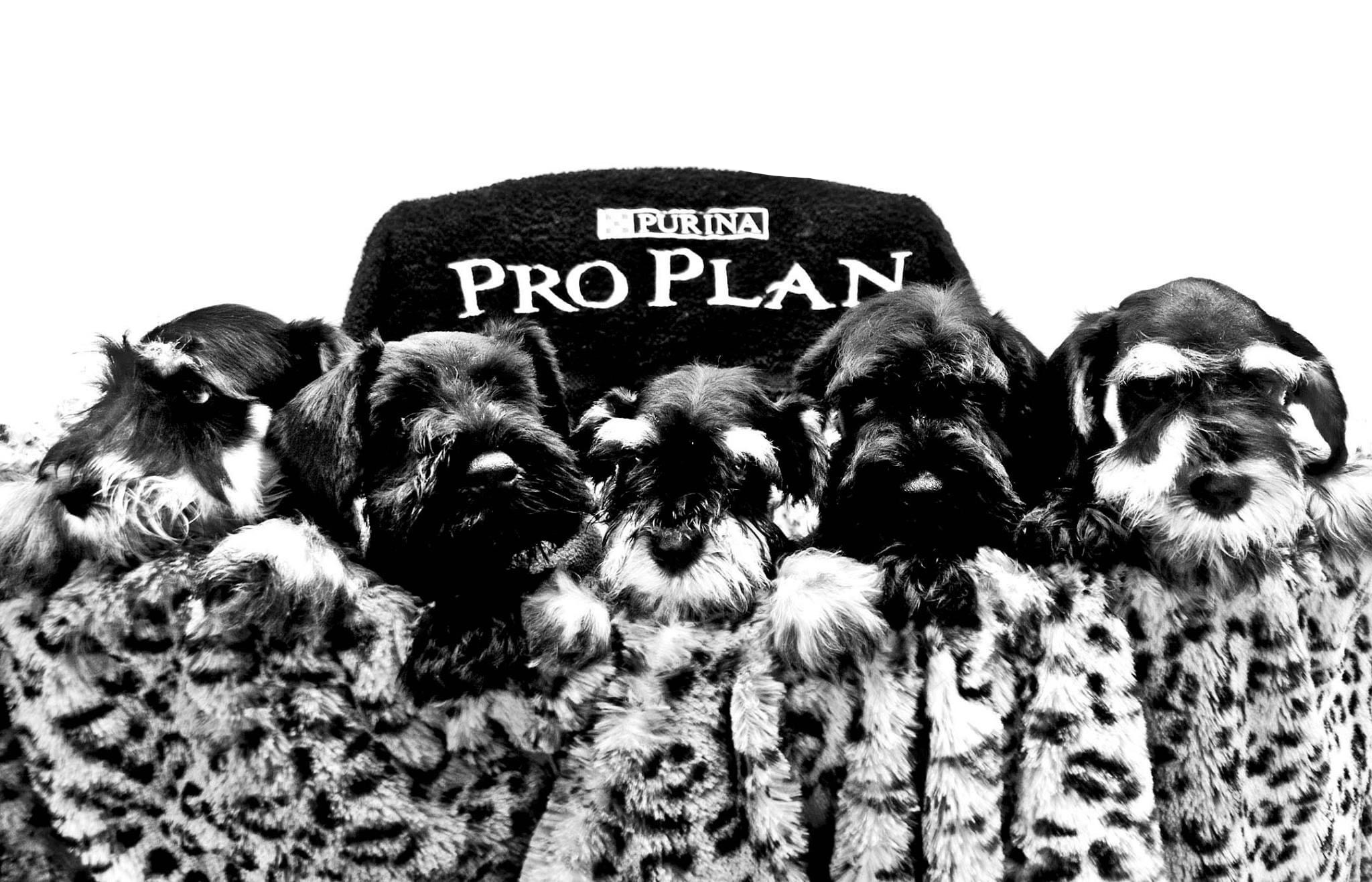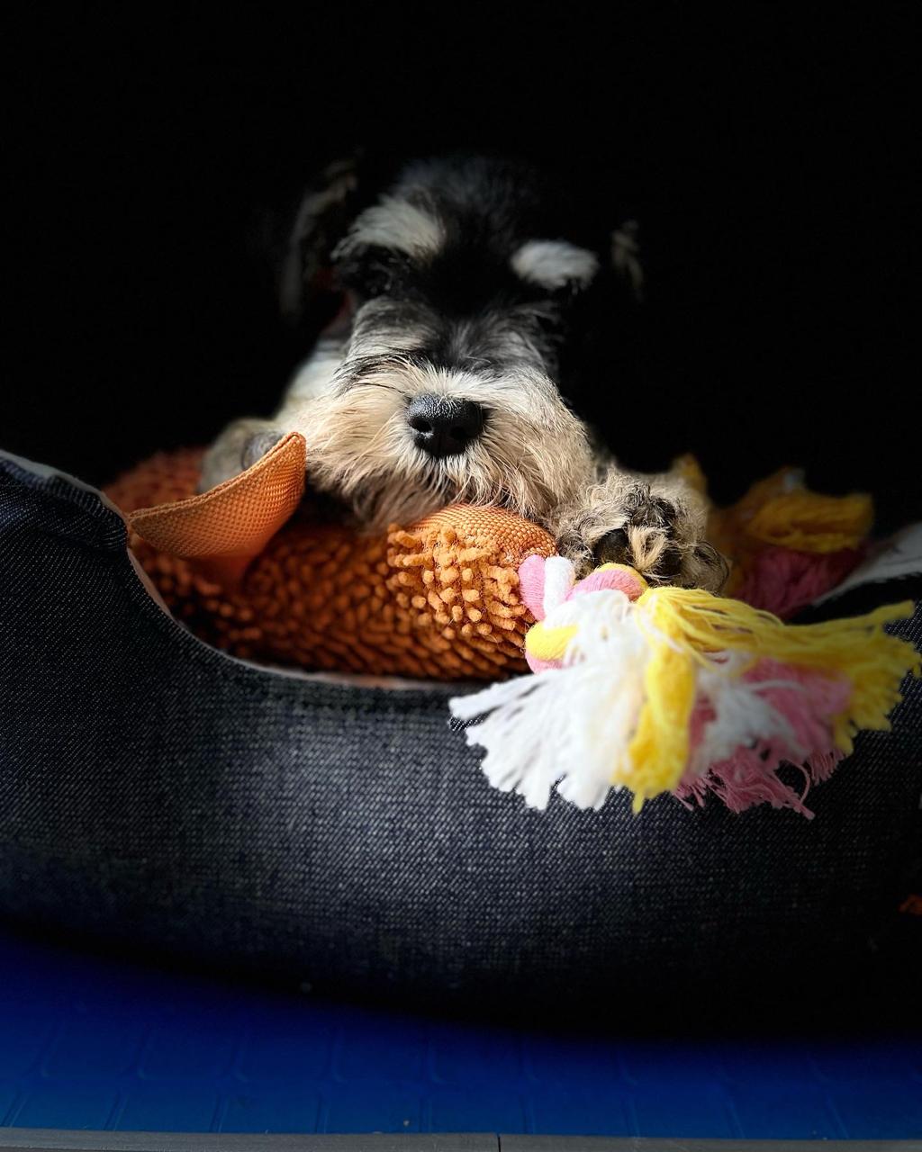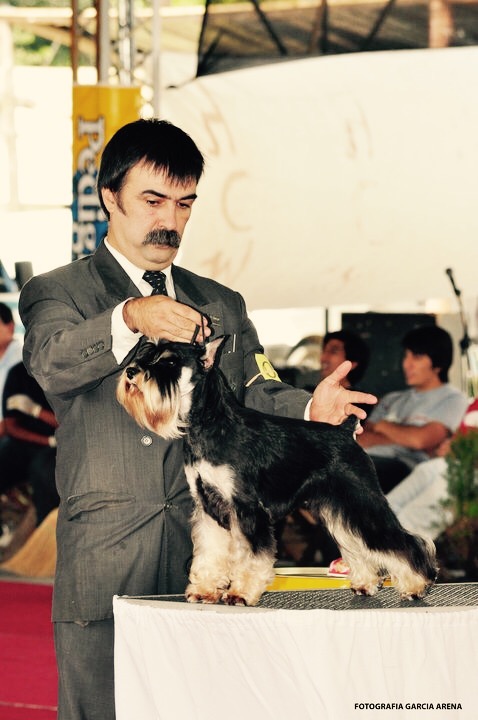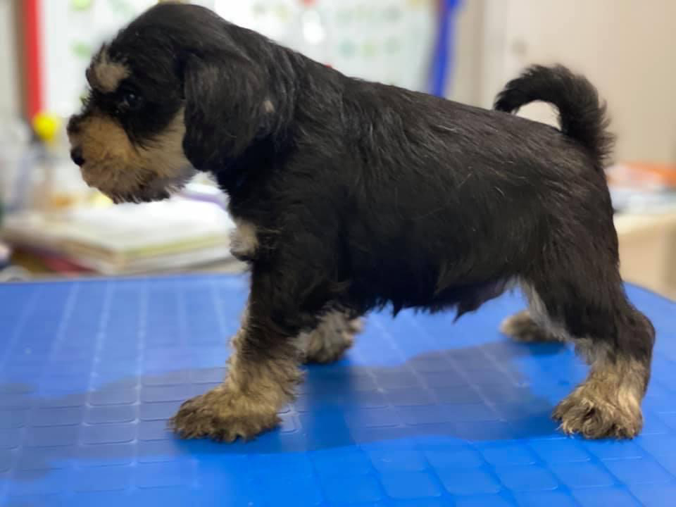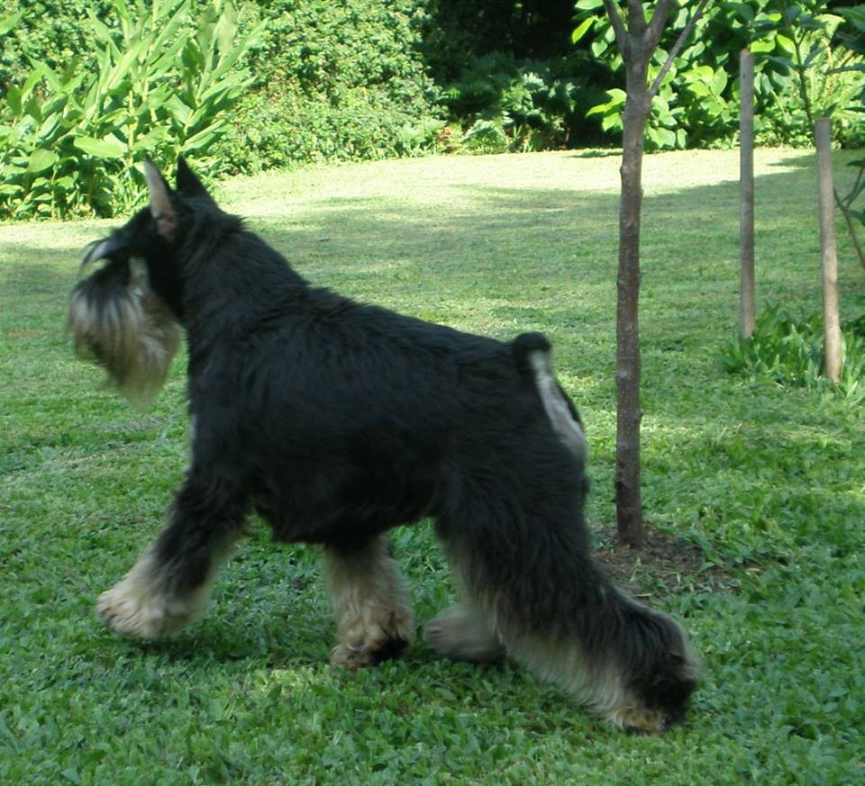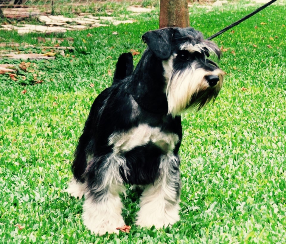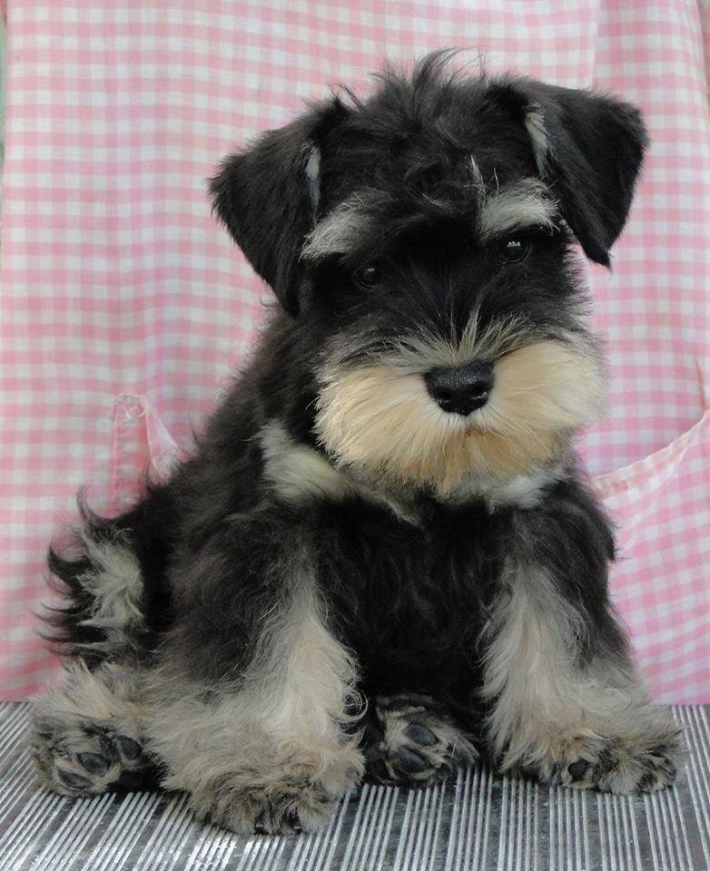 Estos Schnauzer tienen un pelaje que combina zonas de color negro y plata, creando un aspecto muy distintivo y elegante. La plata suele estar presente en el hocico, las cejas, la barba, el pecho, las patas y la parte inferior de la cola, mientras que el resto del cuerpo es de color negro.